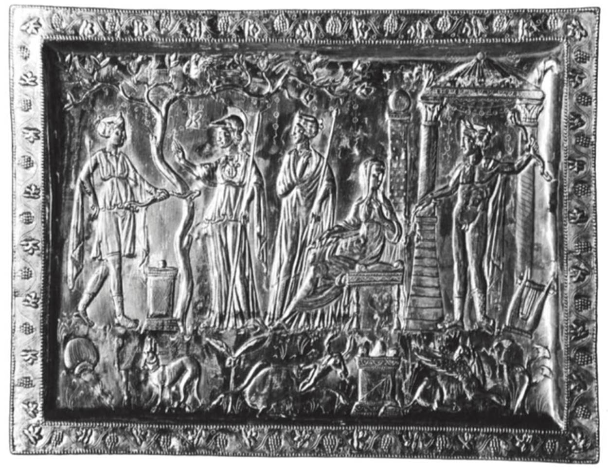 Although the individual figures are familiar, the assembly of characters is unique. The figural style, the facial type, and the details of costume, architecture, flora, and fauna show clear relationships to objects from both the Traprain Law (no. 389) and Esquiline treasures (nos. 309, 310). Both of these treasures date to the late fourth or early fifth century and have been thought to originate in Western workshops, possibly in Rome. This lanx has been traditionally associated with Ephesus, a major center in late antiquity near Delos with its own ties to the worship of Apollo, Artemis, Leto, and possibly Ortygia. A second and perhaps more significant association is with the emperor Julian the Apostate. The subject matter of the lanx, complex and learned in its allusions, seems appropriate to the revival of pagan cults under Julian. Specifically, the lanx is associated with his official visit to the shrine of Apollo on Delos and his sacrifice to the cult in 363.