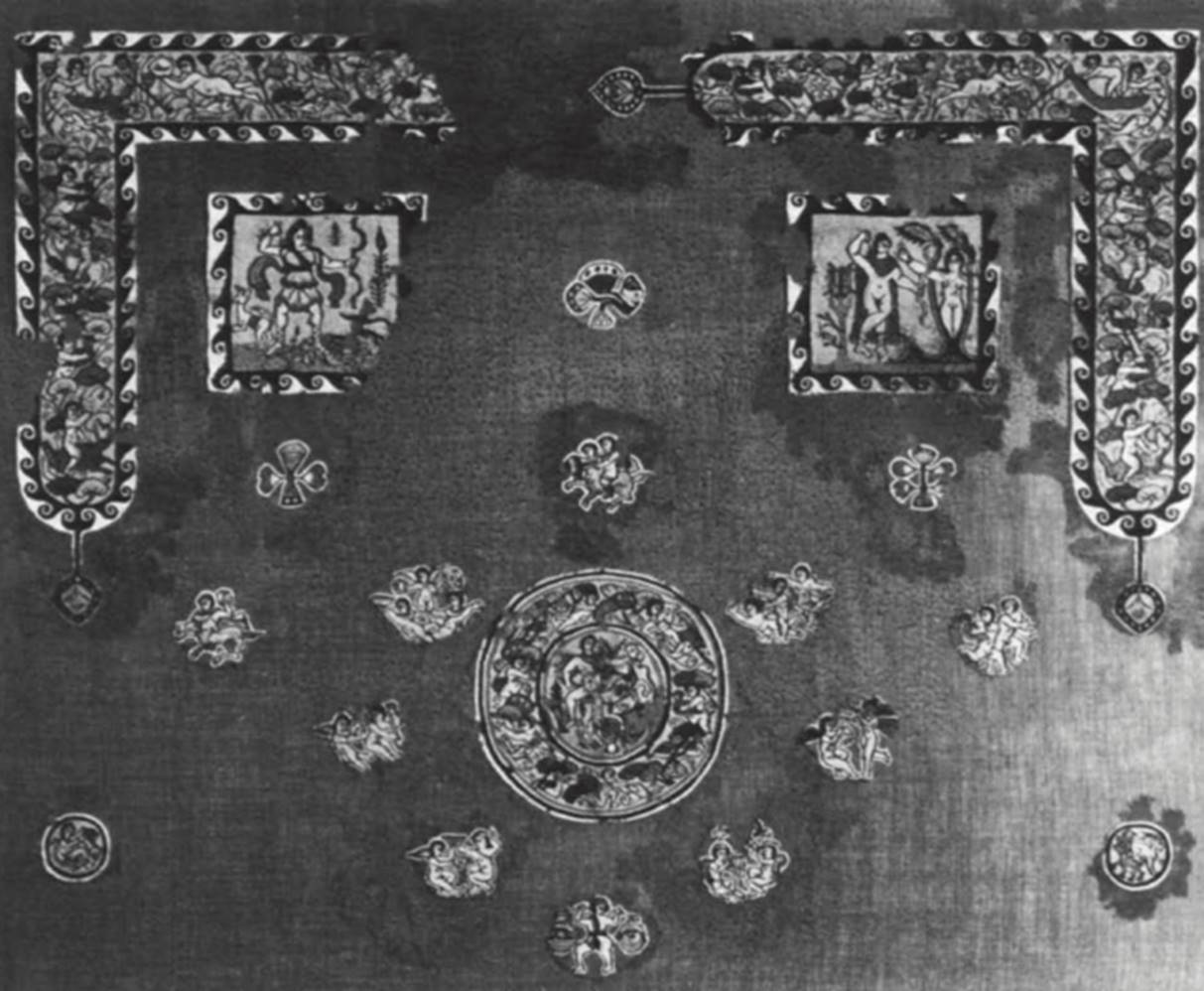 The central medallion is surrounded by a Nilotic frieze similar to the corner friezes. The central scene depicts Bellerophon restraining his rearing winged horse, Pegasus, above the body of the Chimera, a three-headed (lion, goat, snake) monster. Again the composition makes little sense. Bellerophon and Pegasus seem to be derived from a classical type originally used for the Dioscuri. The Coptic artist has actually conflated two events in Bellerophon's career, the taming of Pegasus and the victory over the Chimera (nos. 143, 144).