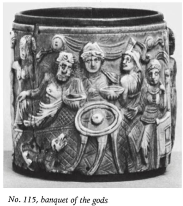 Pyxis with banquet of the gods and Judgment of Paris. Egypt, early 6th century. Ivory