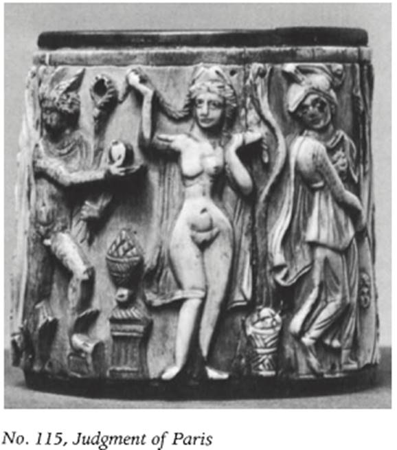 The style of the pyxis clearly points to an origin in Egypt in the early sixth century. It resembles a Coptic ivory plaque of Apollo and Daphne in Ravenna (fig. 16). Although the pyxis is more classical than the plaque, its forms are rendered in a stiff fashion. A very similar piece is the Aphrodite-Adonis pyxis in Zurich (Volbach, 1976, no. 98).