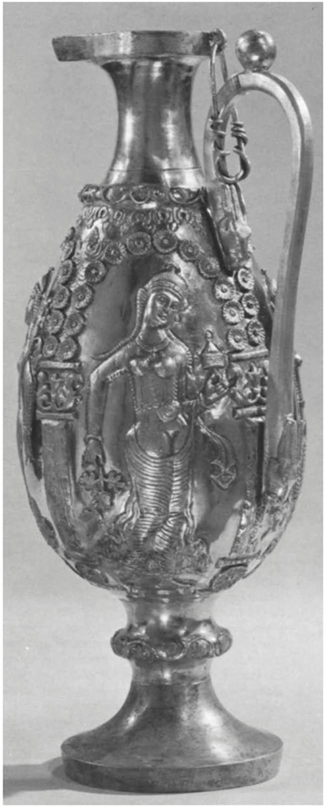The shape of the ewer is derived from Western types of the late fourth or early fifth century. Distinctive Sassanian features are the upper arm resting on the shoulder of the vessel and the strongly accentuated moldings below the neck and on the foot and the paired-line patterns on the drapery of the female figures.