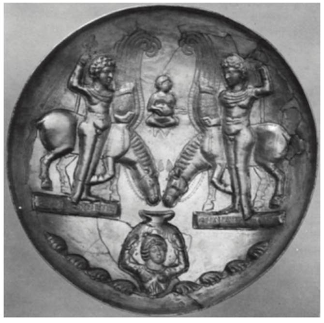 The depiction of these horses as winged has led Ettinghausen (1972) and Ghirshman (1974) to conclude that this scene is derived from representations of Pegasus and Bellerophon. The duplication of the subject on the Sassanian plate, however, requires some explanation. Mirror images were not commonly used in Sassanian art simply for reasons of design. It is probable that the artist intended to represent a pair of figures. Any interpretation of the scene should therefore explain the presence of twins. The controversy surrounding the meaning of this scene often occurs with Sassanian subjects adapted from Western motifs, and it is possible that in this instance, as in others, the iconography developed from more than one Western source.