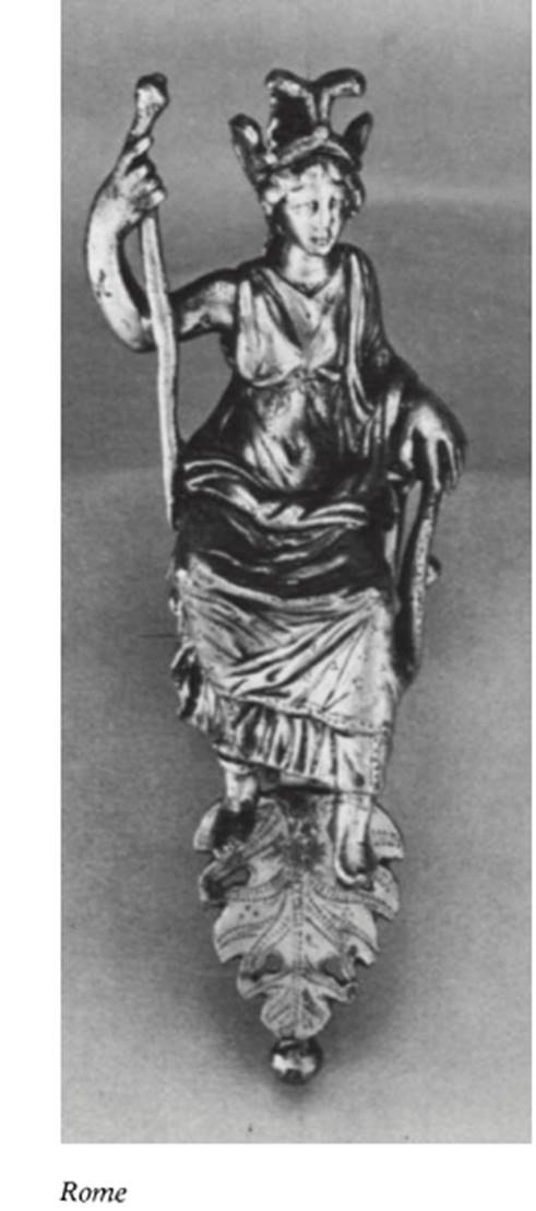 Discovered in Rome in 1793 along with many other silver objects known collectively as the Esquiline treasure, the statuettes are stylistically related to major pieces of the treasure (nos. 309, 310), which are in turn linked to such late fourth-century finds as the Cor bridge lanx (no. 110) and the treasure of Traprain Law (no. 389). The great size of the Esquiline silver find is indicative of the wealth of its original owners. The iconography of these ornaments suggests the owners were politically powerful as well. Bibliography: Dalton, 1901, nos. 332-335, pi. xx; Toynbee, 1947, p. 144, pis. V, VI; Dohrn, 1960, no. 12, pi. 3.