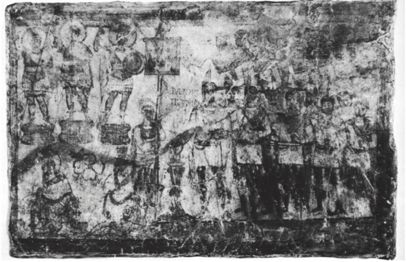 The panel divides into two unequal parts, separated by a vexillary, who stands left of center, holding up the standard that identifies the unit as the Twentieth Palmyrene cohort, an auxiliary force stationed at Dura on frontier duty. To the right, the members of the cohort have been arranged schematically in two rows, following the Late Antique convention for group compositions that equated “above" with "behind." Terentius, their tribune, stands prominently near the center of the panel at the head of their ranks, making an offering at a thymiaterion. He is also clearly identified by a Latin inscription: iVL(ius) terentivs TRro(unus). The soldiers behind him make the right-handed gesture of adoration, as does the leading figure in the upper row, identified by a Greek inscription as Themes, son of Nokimos, priest. The names are Palmyrene, which suggests that Themes may have been the official priest or chaplain of the unit because he has been singled out in addition to the tribune. Despite the damaged surface, the overriding static quality of the ranks preserves the sacred nature of scene and act.