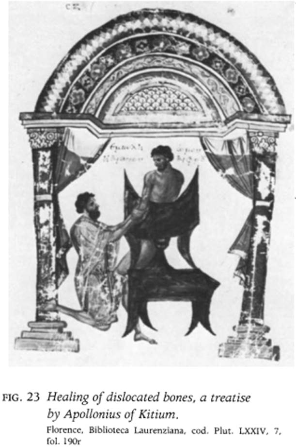 The tenth-century Dioscurides (no. 181) proves that medieval copies of scientific illustrations from late antiquity could be quite exact. Other medieval scientific manuscripts can also be assumed to reflect a high degree of faithfulness to Late Antique models. It is only through such copies of illustrated medical treatises that we learn of Late Antique compendia in codex form and their archetypes that may possibly date to the period of the papyrus roll. Examples of Hippocratic healing methods are preserved in a tenthcentury treatise by Apollonius of Kitium, which demonstrates the setting of dislocated bones (fig. 23), and a medieval Latin handbook on midwifery by Soranos of Ephesus, which pictures the different positions of the embryo in the uterus (no. 187).