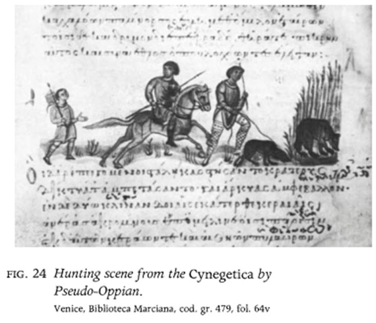 To judge from their wide reflections in other media, hunting treatises must have enjoyed particular popularity. Whereas a profusely illustrated manuscript of Pseudo-Oppian from the eleventh century in Venice displays an extraordinary variety of hunting techniques (fig. 24), selected hunting scenes in late classical mosaics and silverwork (no. 251) demonstrate once more how valuable the miniature cycles were as a repository of iconography.