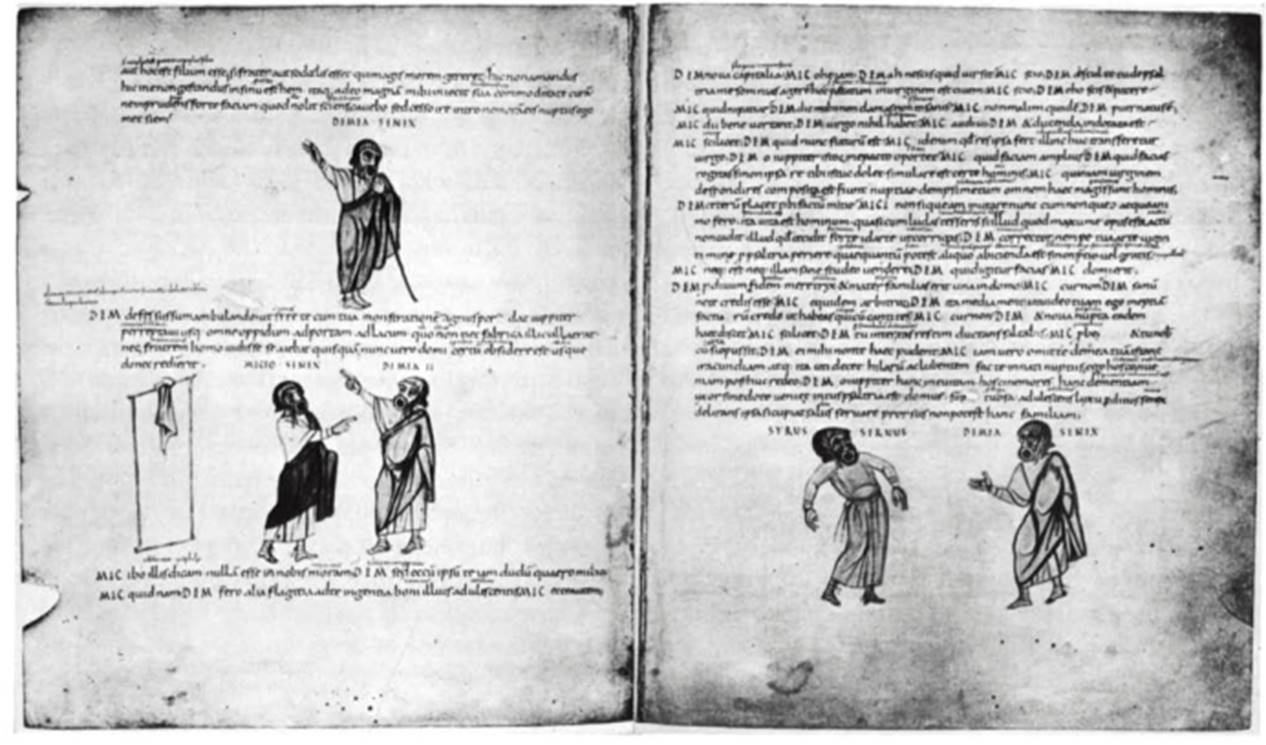 Fig. 27. Scenes from the Adelphoe of Terence. Vatican Library, cod. lat. 3868, fols. 60v-61r