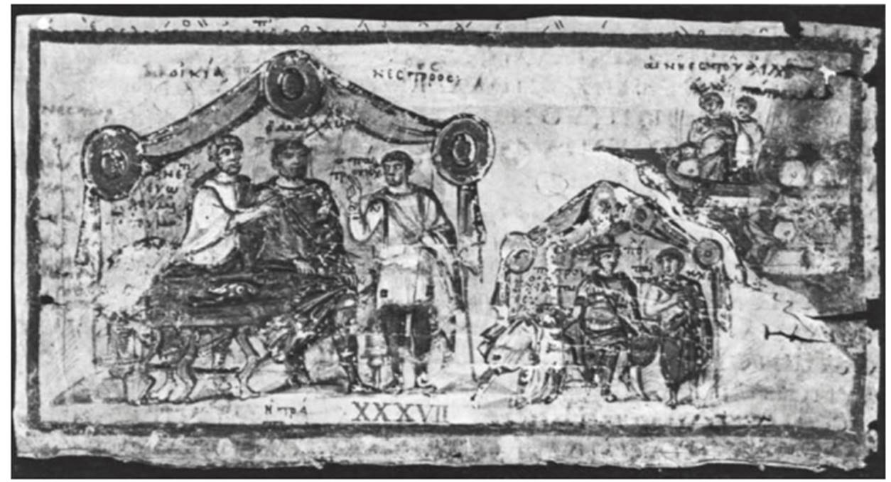 Miniature XXXVII (Book 11). Three scenes are here combined. In the first, Achilles stands in the stern of his ship, watching the battle, which turns against the Greeks (598-615). With him is Patro- clus, whom he sends to the tent of Nestor. In the second scene, Patroclus stands in the entrance of the tent conversing with Nestor, who sits beside the wounded Machaon (643-802). In the third scene, on a smaller scale, Patroclus treats the wounded Eurypylus, while to the right stands a third figure (wrongly inscribed "Patroclos" by the medieval commentator). In the two lower scenes a larger seated figure is flanked by two others, mostly on a smaller scale; such compositions are often in use in later Roman art for royal or imperial subjects (cf. no. 64).