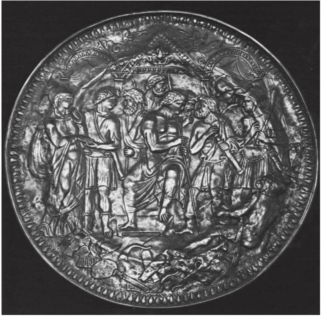 The plate is difficult to date with precision but resembles in ornament and style other silver plates of the fourth century. Its place of manufacture is unknown, but it was found in the Rhone near Avignon in 1656. It was long known as the Shield of Scipio, because the scene was thought to depict that famous Roman. Among the largest known of its kind, the plate indicates the size and luxury of antique silverwork commissioned by pagans and Christians alike. Bibliography: Chabouillet, 1858, no. 2875; Babelon, 1900, no. 2875; Levi, 1947, I, p. 48; Carandini, 1963-1964, pp. 15-16, pi. in, fig. 7.