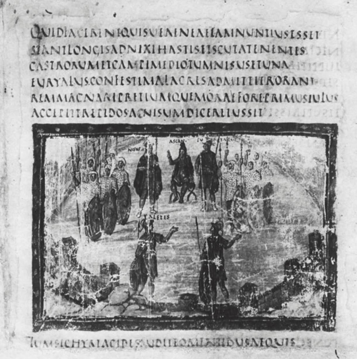 The second of the two Vergil manuscripts in the Vatican Library has an almost complete text of the Eclogues, Georgies (no. 225), and Aeneid. The nineteen miniatures were for centuries considered inferior products; but recently their rough, expressive style has been better appreciated. The Aeneid miniatures are all full-page and framed. As in provincial art in general, there is less interest in three-dimensional space than in a neatly laid-out surface. The figures lack classical structure and proportion; faces are mostly expressionless masks, with staring eyes, seen either in three-quarter or profile views. The linear drapery obscures the bodies; gestures are often exaggerated for emphasis. Two pictures exemplify these qualities.