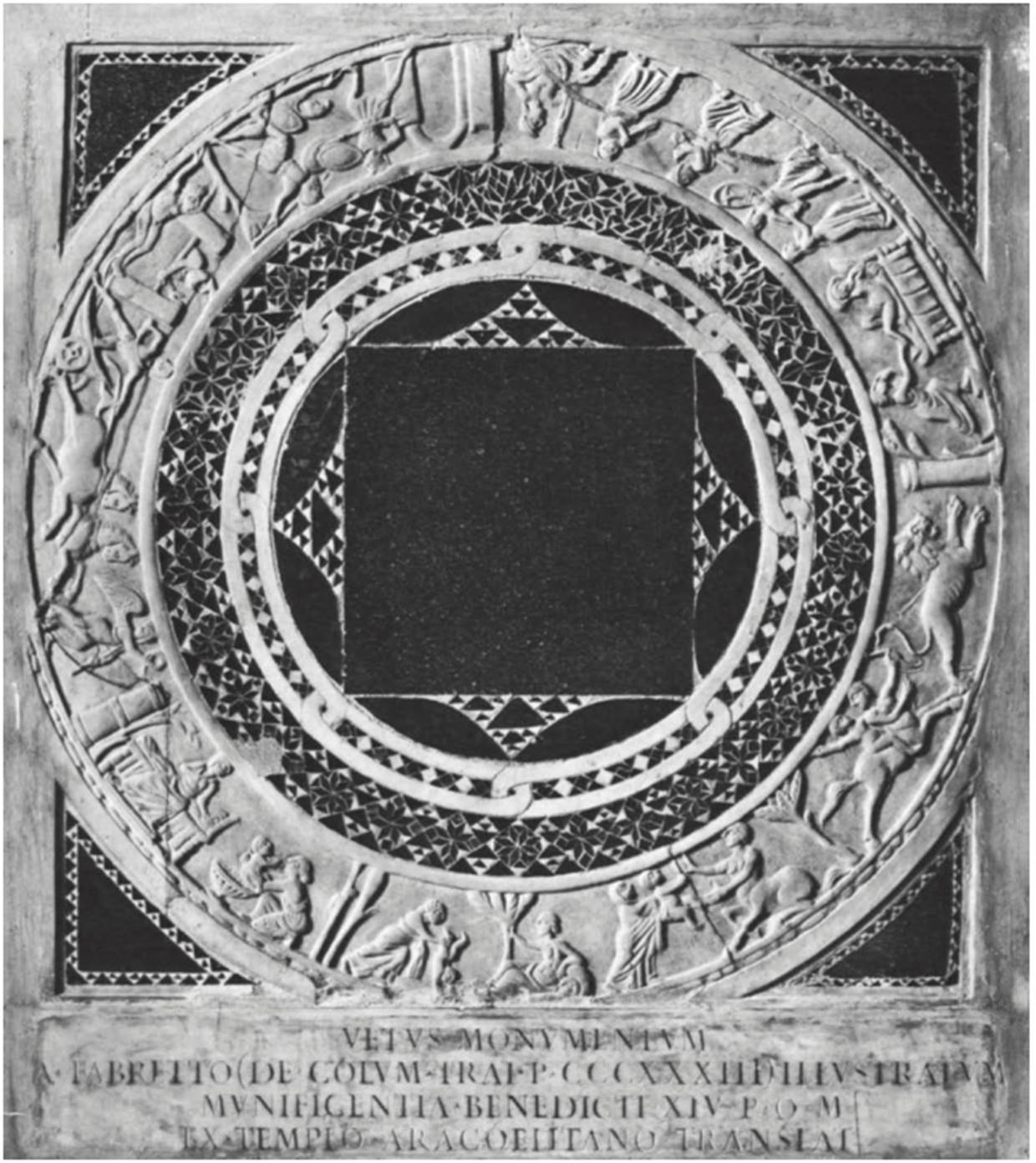 The low marble plate is enclosed within a square slab, also of marble. The basin of the plate and the corners of the marble slab are decorated with geometric mosaics. The only part of the plate now visible is the low relief band on the rim. The plate is cracked in several places and the first and seventh scenes have been partially restored.