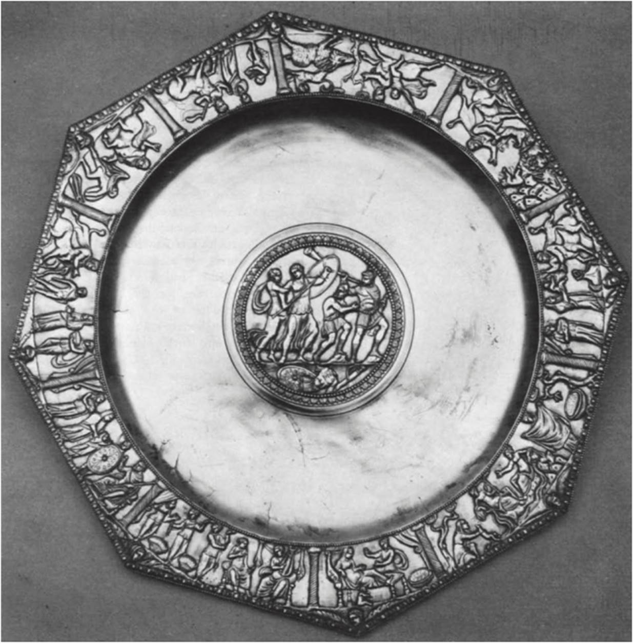 The plate belongs to a silver hoard discovered in 1961—1962 at Augst, Switzerland (see nos. 126, 251). This hoard, buried after 351, was initially associated with the departure of Julian the Apostate for the East in 361. In this case the plate may have belonged to the emperor, who venerated Achilles as a model of heroic virtue. However, recent studies of the coins from the hoard have suggested that it was buried slightly earlier, during the revolt in 350 of the ill-fated Magnentius. Bibliography: Salomonson, 1962, p. 80; Strong, 1966, p. 197; Cologne, 1967, p. 338, fig. H 9a; Laur-Belart, 1967; Instinsky, 1971, pp. 7-9, pis. 1, 2; Manacorda, 1971.