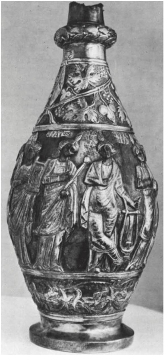 This pitcher was found in a tomb and may well have had some such meaning for the man whom it accompanied. Unfortunately, the tomb was excavated by local farmers, and little is known of its circumstances. It was found in 1918—1919 at Bolshoi Kamenets in the Dnieper basin. On the underside of the pitcher is a silver stamp, which indicates that it was made in Constantinople in the late fourth or early fifth century (Dodd, 1961, pp. 4-5); a vase of similar shape but with Christian iconography was found in the Traprain Law hoard in Scotland (no. 389). Although the figures have classical models (perhaps in sarcophagi), their frontality, heavy proportions, and oddly tilted heads indicate a date in the post-Constantinian period. The decorative friezes, a characteristic of early Byzantine silver, are particularly fine. Bibliography: Matzulevich, 1934, pp. 119-125; Dodd, 1961, no. 84; Bank, 1966, p. 333, pis. 2-5; Strong, 1966, p. 191; Pisarskaya, 1970, pis. I-IХ.