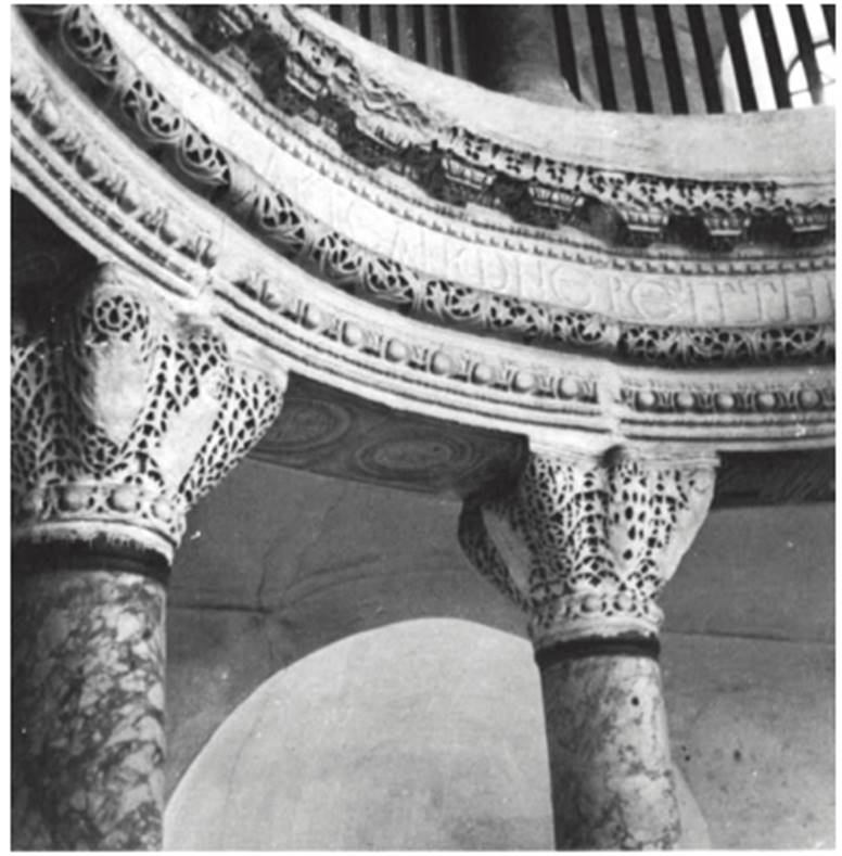 The entablature possesses two friezes, the flat inscribed one and, more conspicuous and in apparent contradiction, a cushioned frieze (cf. no. 246). Despite these unclassical features, a visual harmony is achieved by the bold patterned carving, which unites frieze and cyma with the openwork carving of the capital. Bibliography: Kautzsch, 1936, pp. 187-189; Deichmann, 1956, pp. 72-76.