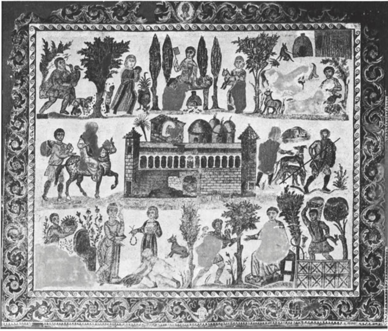 Many rural occupations were depicted according to the seasons, and a special set of occupations developed in connection with the calendar. Once more we notice the impact of a literary genre. How variegated and rich in observation such calendar pictures could be is demonstrated by the frescoes from around 300 recently discovered under the floor of Sta. Maria Maggiore in Rome (fig. 33), where for month of September the harvesting of fruit is shown in great detail.