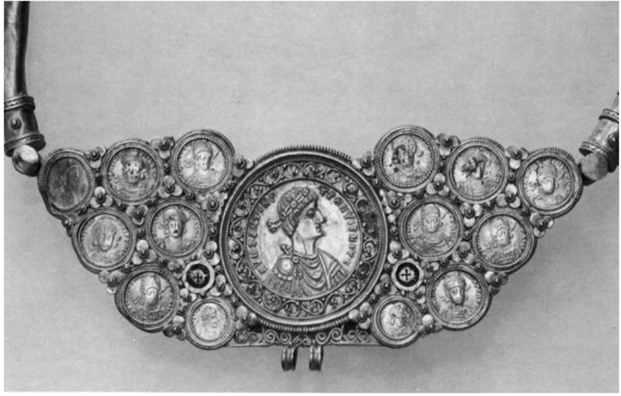 A sixth-century source tells us that Justinian's great general Belisarius recompensed his soldiers with large gifts of money and honored them with bracelets and necklaces (Procopius De bello Gothico 1. 1. 8). Earlier sources report that both neck-rings and coins played a role in coronation ceremonies. Consequently, there can be little doubt that this pectoral represents a collection of military trophies, which belonged to a distinguished general, if not to an emperor.