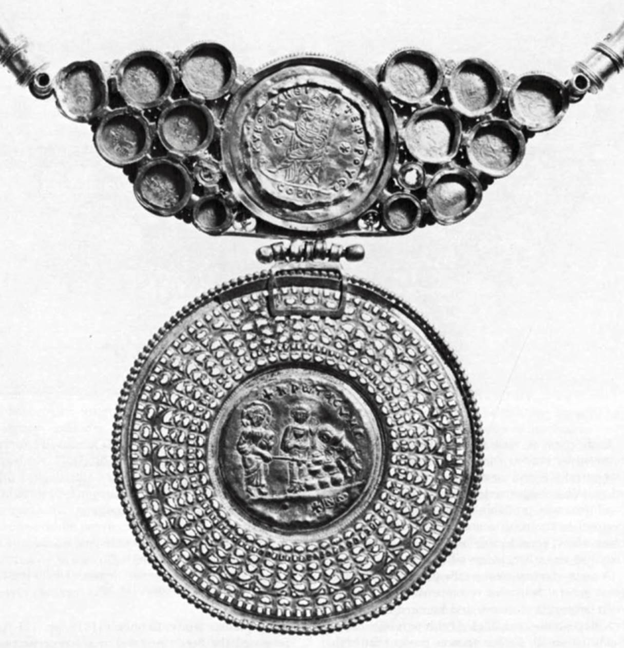 In his pioneer study, Dennison (1918, pp. 121 ff.) proposed the Berlin pectoral as a counterpart of the Morgan pectoral (no. 295). However, the coins of the latter range from the fourth to sixth century, while those of the Berlin piece range from the mid-sixth through the beginning of the seventh century. The format of the central medallion of the Berlin piece is comparable to that of the Morgan piece, although not as fine in execution; but its inscription (the same on both sides), is Christian and in Greek: