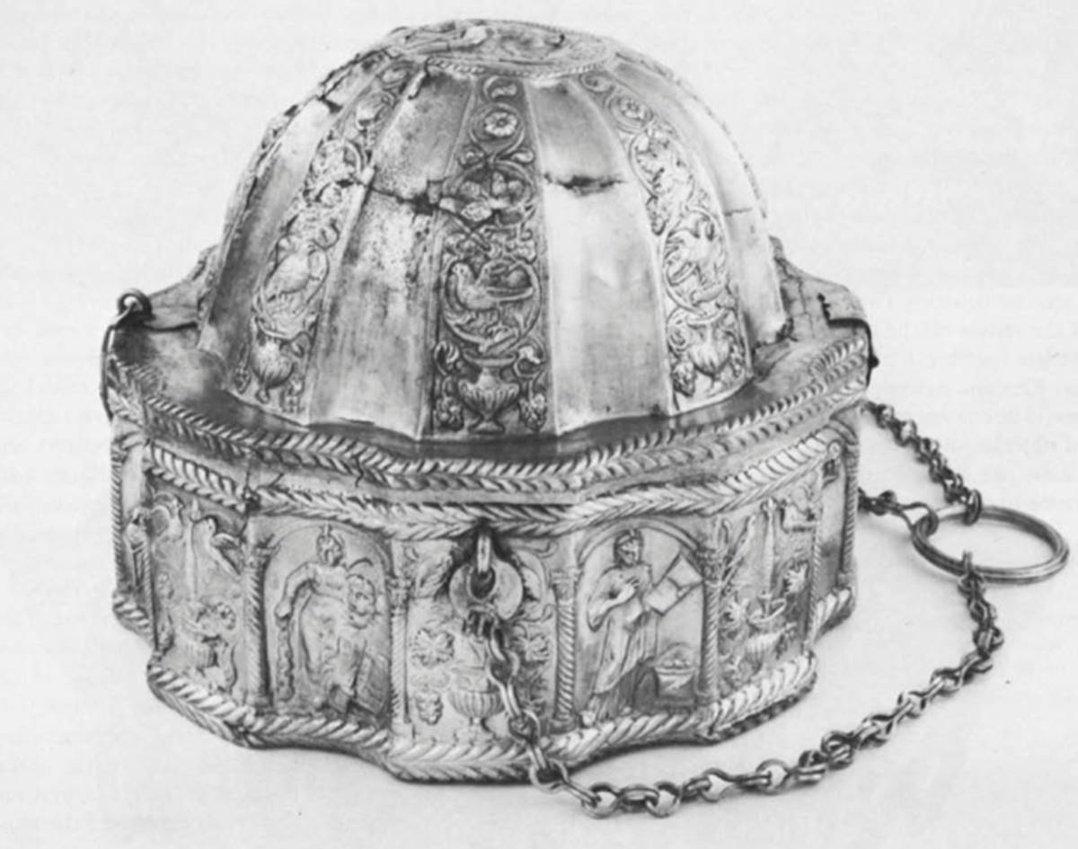 The casket, which can be suspended from three chains attached to a large ring, contains five small vessels for perfumes and unguents fitted into openings in a horizontal bronze plate. The domed cover of the casket is joined to the body with a hinge and is closed and secured by means of a tapering hasp and staple. Representations in mosaics and wall paintings have shown objects that closely resemble the muse casket in the context of the Roman bath.