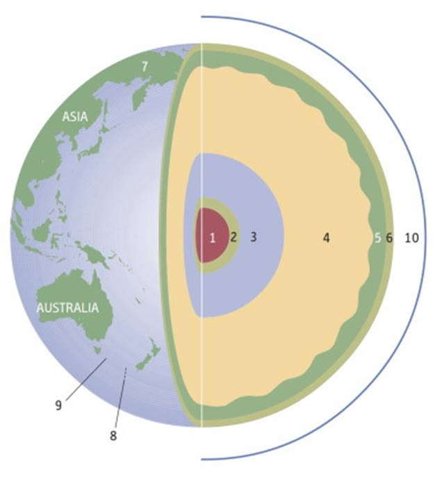 The interior of the Earth. If the Earth was cut in half and the interior structure exposed, the layers would appear as in Figure 2.1. At the centre of the planet is a core that has a radius of 3470 km. The inner core is solid and very dense (- 13 g cm3) with a thickness of 1390 km. It is magnetized, and has a temperature probably in the region of 3000°C. The solid inner core is surrounded by a transition zone about 700 km thick, which in turn is surrounded by a 1380 km thick layer of liquid material that together form the outer core. It is somewhat less hot than the inner core and also less dense (- 11.5 g cm3).
