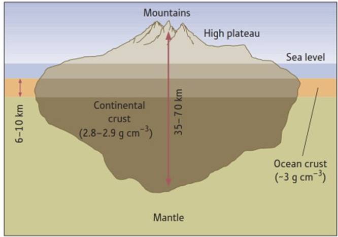 Figure 2.2. Diagrammatic cross-section of crust and upper mantle showing the principle of isostasy. This shows the less dense continental crust ‘floating’ on the upper mantle in a similar way to the manner in which an iceberg floats in seawater