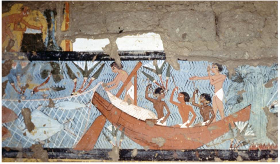 Details from a painting found in an Egyptian tomb from the nineteenth Dynasty (1292-1189 BCE) in Deir el-Medina, depicting Egyptian fishermen casting nets (Werner Forman/Universal Images Group/Getty Images)
