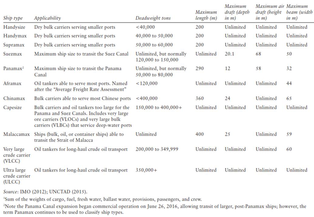 Shipping continues to be the most cost-effective method of moving goods over long distances. The continued globalization of trade combined with more efficient shipping technologies will likely result in the continued dominance of global trade by shipping. Currently, the world’s merchant shipping fleet consists of approximately 91,000 ships owned by more than 250 companies representing approximately 1.7 billion dwt (see later) with an average ship age of twenty-two years. In 2010, shipping employed over 1.4 million seafarers from 150 states. Table 8.1 provides a summary of the various ship classifications and sizes; however, the primary types of modern merchant ships are as follows:
