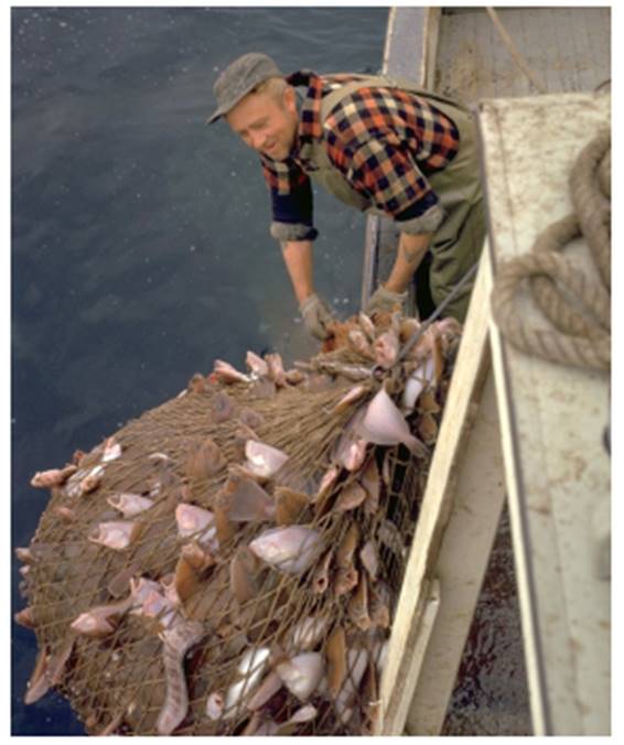 Fishermen hauling trawl nets filled with cod. Atlantic cod biomass is estimated at 6 percent of historical levels and North Sea cod stocks are significantly depressed as well (Corel)