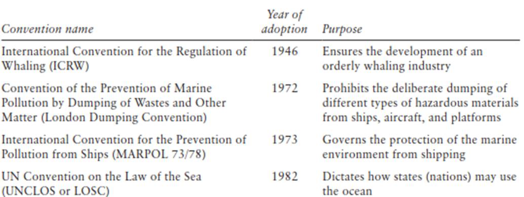 Currently, there are approximately 100 treaties and agreements (also termed conventions) that govern how humans use the oceans; however, a number of seminal international agreements govern human activities on two-thirds of the world’s surface. They are (in chronological order):