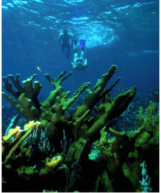 Two snorkelers explore the Florida Reef located in Biscayne National Park in southern Florida. Much of the park is actually underwater, with boundaries that include Biscayne Bay, some of the northern Florida Keys, and the mangrove forests of the Florida shoreline (National Park Service)