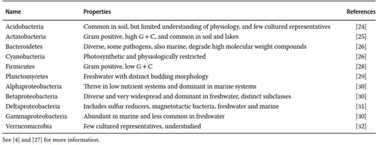 Table 1. Common bacteria phyla found in streams with very general statements about their characteristics