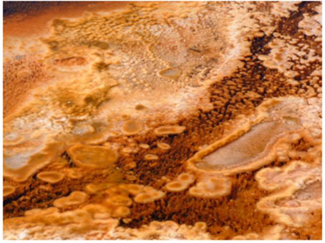 Figure 1. A photograph of a microbial biofilm (in the form of an extensive microbial mat) in Yellowstone. Shown in this image are conical, columnar, and lilypad stromatolites shaped by cyanobacteria (Leptolyngbya) that form in some of the quiet hydrothermal pools [1]. Silicate precipitates are present, in association with the biofilm. This image represents some of the complex 3-dimensional architecture that can be associated with a biofilm. Source: Photo by P. Maurice