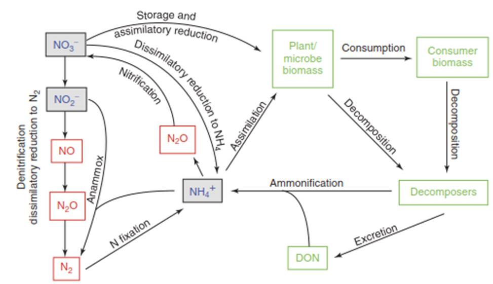 Figure 1. The N cycle in soil, sediments, and water. Organic N is shown as green, ions are blue, and gases are red. Dissimilatory reduction to N2 includes annamox, AOMD, and anaerobic oxidation of H2S (see text). The large range of valences for N (Table 1) provides energetic pathways for microbes to exploit along redox gradients
