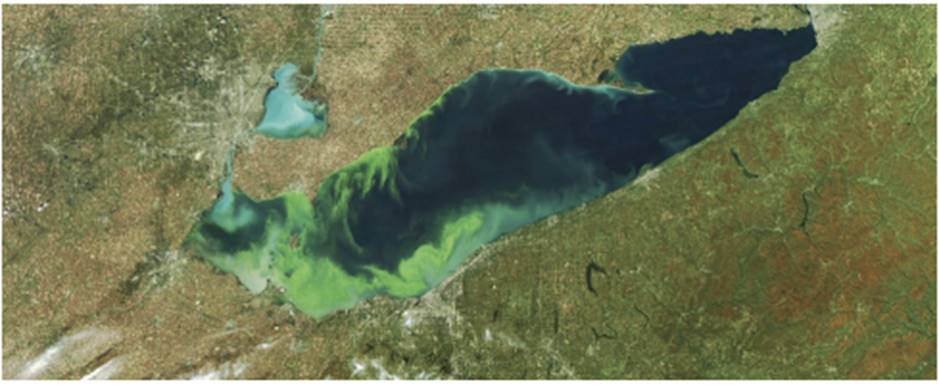 Figure 2. Satellite image of a cyanobacterial bloom in Lake Erie, Michigan, USA, in 2011. Source: Photo credit: NASA Earth Observatory