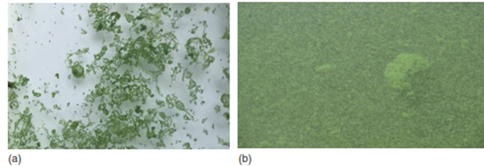 Figure 4. (a) Microcystis aeruginosa, Lake Okeechobee, Florida, USA, June 2018. Source: Photo credit: Barry H. Rosen. (b) Aphanizomenon flos-aquae, Upper Klamath Lake, Oregon, USA, 2011. Source: Photo credit: Jacob Kann