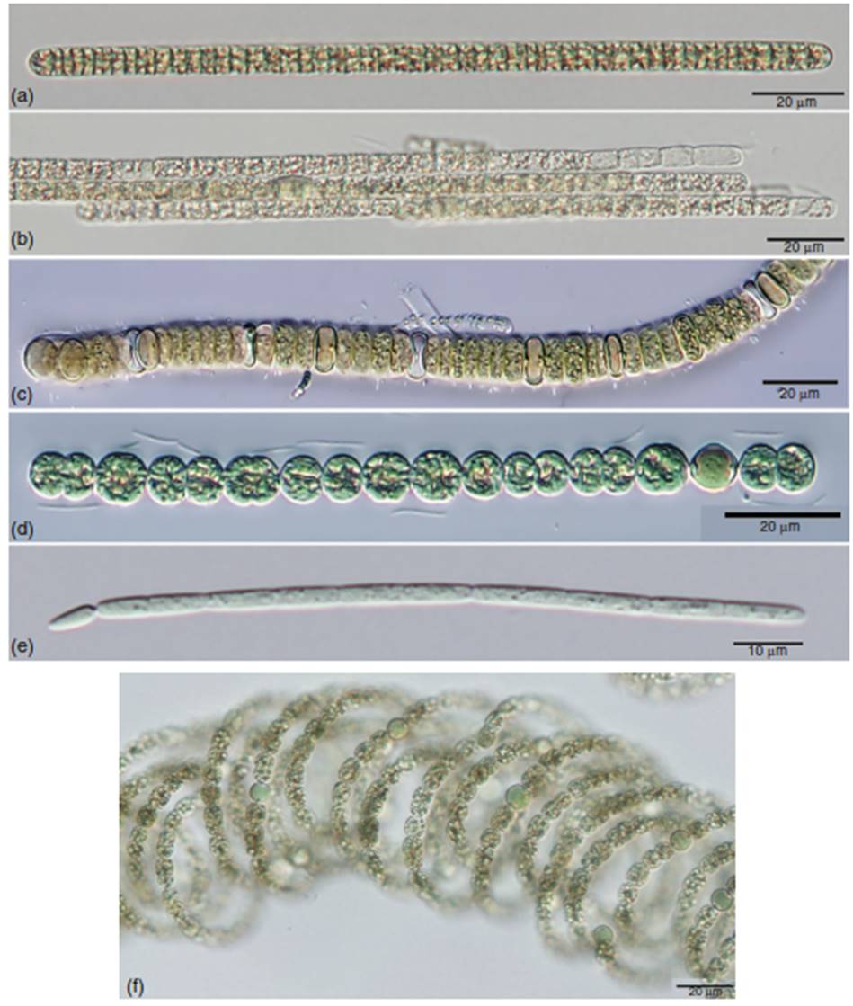 Figure 5. Common bloom-forming filamentous cyanobacteria: (a) Planktothrix suspensa, (b) Aphanizomenon flos-aquae, (c) Nodularia spumigena, (d) Dolichospermum sp. (e) Cylindrospermopsis raciborskii and (f) Dolichospermum circinale. Source: Photo credits: Barry H. Rosen