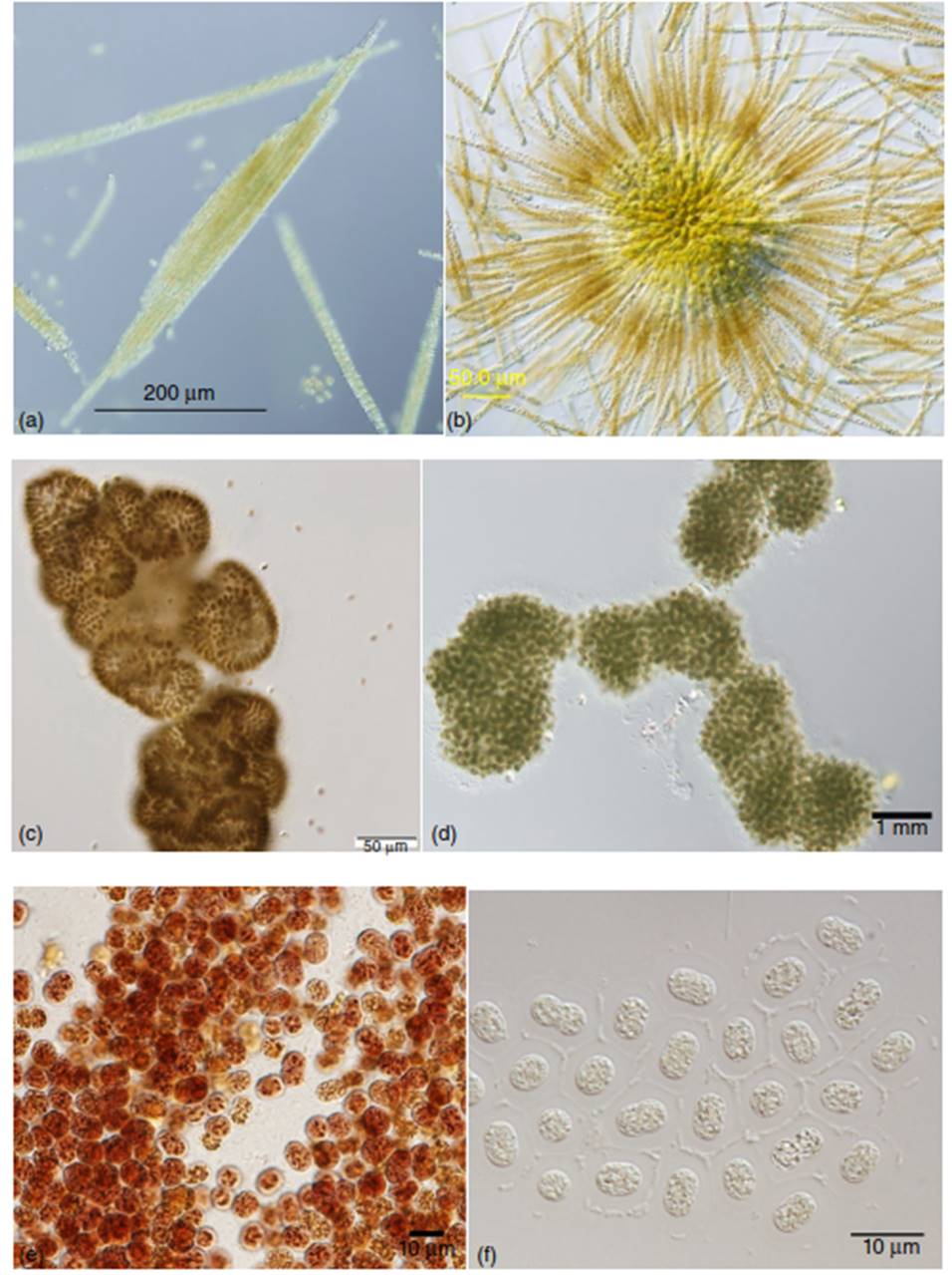 Figure 6. Common bloom-forming cyanobacteria. (a) Aphanizomenon flos-aquae, (b) Gloeotrichia echinulata, (c) Woronichinia naegeliana, (d-f). Microcystis aeruginosa. Source: Photo credits: Barry H. Rosen