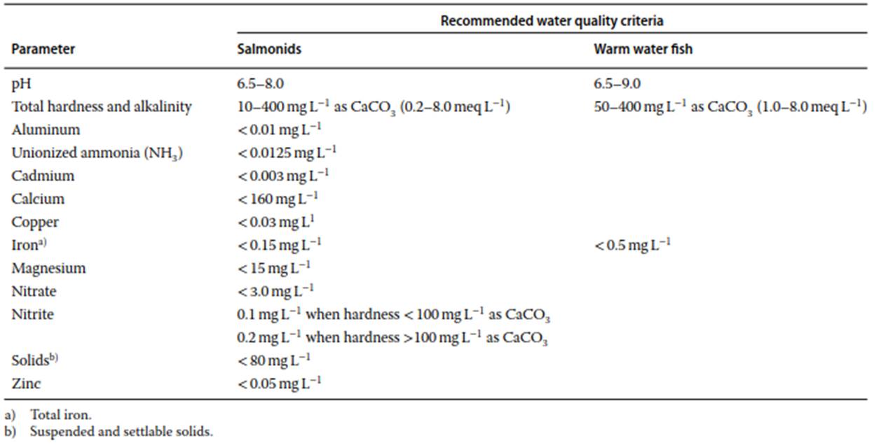 Table 1. Summary of recommended water quality criteria for salmonid and warm water fish production