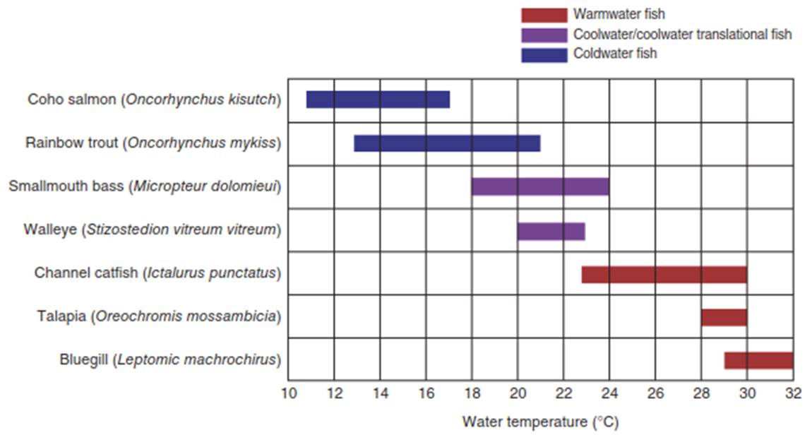 Figure 1. Optimum temperature ranges for representative freshwater fish (synthesized from [3,5-8]). When water temperature deviates from the optimum temperature range, poor fish feeding response, lethargy, and in some cases mortalities, may be observed. The degree of impact depends largely on the magnitude of the deviation from the optimum water temperature range