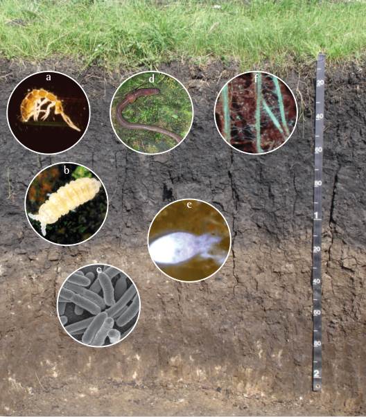 Fig. 1.2: This highly simplified figure aims to give some idea of the distribution of organisms vertically through the soil profile. It is clearly an oversimplification and in fact microorganisms such as bacteria (c) and protozoa (e) are distributed throughout the soil profile, although with the highest biomass being found near the soil surface which is richer in organic matter. The two collembolans are adapted for living at different soil depths with the species shown in (a) being more adapted for living on or near the soil surface and that shown in (b) being more adapted to living at deeper levels. These differences are discussed in more detail in Section IX.