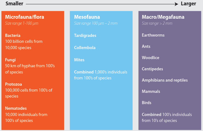 In addition to size-based grouping, some soil biologists classify the soil biota using the metric of effective body width. This method categorizes organisms based on their ability to move through different soil pore sizes, which is a more functional approach to understanding their ecological roles. While the methodology differs, the resulting cutoff points between groups are generally similar, and there is broad scientific consensus on which organisms belong to each respective category, whether defined by size or mobility.