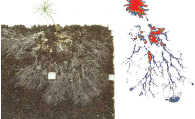 Fig. 2.20: Scan of a microcosm containing a mycorrhizal pine seedling labelled with 14CO2 (14C is a radioactive form of carbon). The image on the right shows where the carbon has been fixed by the plant through photosynthesis and transported down into the roots. The transport of the carbon, in the form of sugars containing 14C into the mycorrhizosphere is clearly visible (from Finlay 2006). Images reproduced with permission from New Phyologist