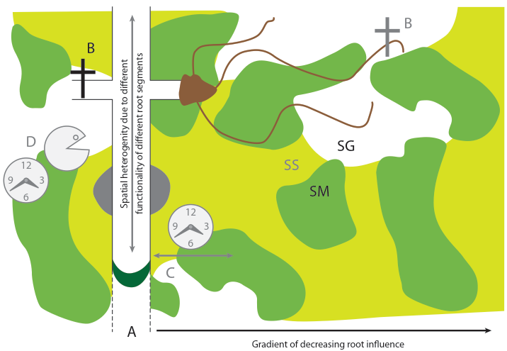 Fig. 2.21: A schematic representation of the rhizosphere as a 3-phase system with soil solid matter phase (SM), soil solution phase (SS), and soil gas phase (SG). Spatial heterogeneity along and perpendicular to root growth added by a developing root system is emphasised and is overlaid by temporal variability: (A) root growth, (B) turnover of roots and fungal hyphae, (C) diurnal or seasonal changes in the activity of roots (i.e. exudation, uptake), or (D) associated organisms. From Luster et al. 2009