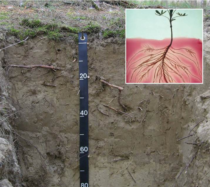 Fig. 2.22: The main photograph shows the roots of trees and herbaceous plants exposed in a cutting within a sandy soil in Hungary. Soil texture and structure are important controls on the development of roots. (EM); The inset shows root exudates binding with aluminium ions in the rhizosphere of Lupinus luteus, thereby reducing their toxicity, as visualised as bleaching of the red Al-aluminon complex. (from Neumann 2006)