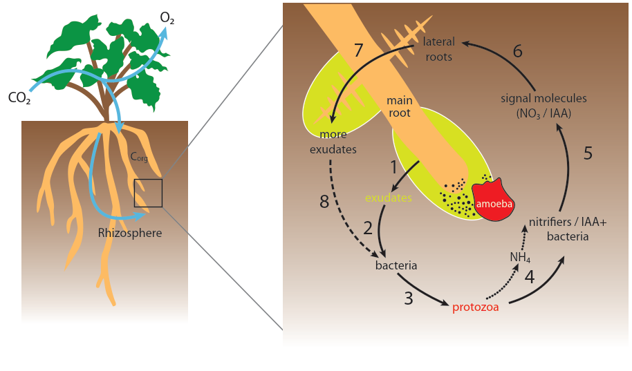 Fig. 2.23: A conceptual model of feedback loops within a rhizosphere involving different members of the soil food web. Root exudation (1) stimulates growth of a diverse bacterial community (2) and subsequently of bacterial-feeders such as protozoa (3). Ammonia is excreted by protozoa and selective grazing favours nitrifiers and indole-3-acetic acid (IAA+) producing bacteria (4). The release of signal molecules (5), such as NO3 - and IAA, induces lateral root growth (6), leading to release of more exudates (7), subsequent bacterial growth (8), etc. From Bonkowski 2004, reproduced with permission from New Phyologist