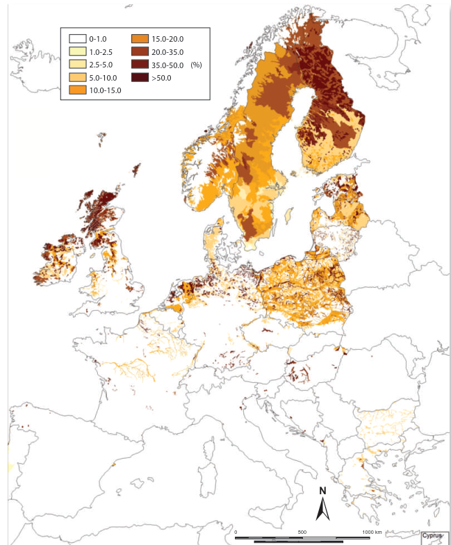 Fig. 3.7: Relative cover (%) of peat and peat-topped soils in the Soil Mapping Units (SMUs) of the European Soil Database