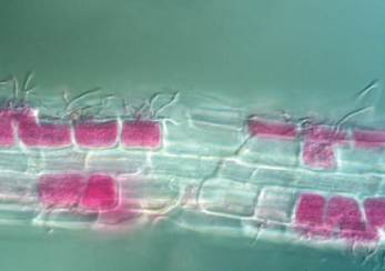 Fig. 3.8: Image showing ericoid mycorrhizal structures (stained red) penetrating inside root cells