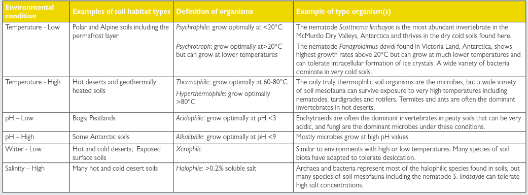 Table 3.3: Some examples of extreme conditions experienced by soil organisms, where such conditions occur and the organisms that are common in these extreme soils