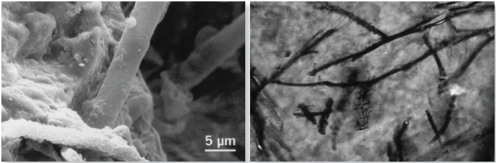Fig. 4.4: Rock-eating mycorrhiza. Left; Scanning electon micrograph showing two fungal hyphae penetrating a feldspar grain: (EHd) Right; Thin section micrograph of a feldspar grain from a Podzol E horizon, criss-crossed by tunnels of about 5μm in diameter; The feldspar grain originates from the E horizon of a 5400-year-old sand dune along Lake Michigan