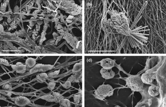 Fig. 4.7: Mycogenic oxalates. (a) Magnesium oxalate and hydromagnesite precipitated on Penicillium simplicissimum; (b) strontium oxalate hydrate on Serpula himantioides; (c) calcium oxalate monohydrate and calcium oxalate dihydrate on S. himantioides; and (d) copper oxalate hydrate precipitation on Beauveria caledonica. Bars (a) 20 μm; (b) 100 μm; (c,d) 20 μm