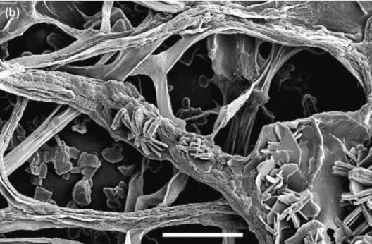Fig. 4.8: Calcite and calcium oxalate monohydrate precipitated on Serpula himantioides. Bars (b) 10 μm
